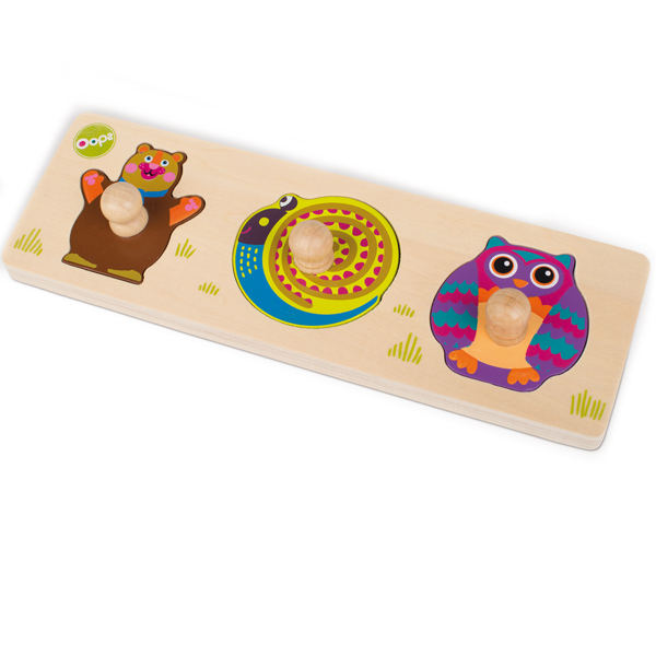 Wooden Sorting Toy – 4 pcs Traditional shape sorter activity combined with fun characters for babys enjoyment. Includes 3 shapes from the Oops® forest or city world crafted in solid wood and decorated with child-safe paint. Baby learns to make accurate movements. Develops problem solving skills. Vibrant colours bring the characters to life. Fun characters! Pack: Cardboard Box with Window Dimensions: H11xW4,5xLx32,3kg Age: 12m